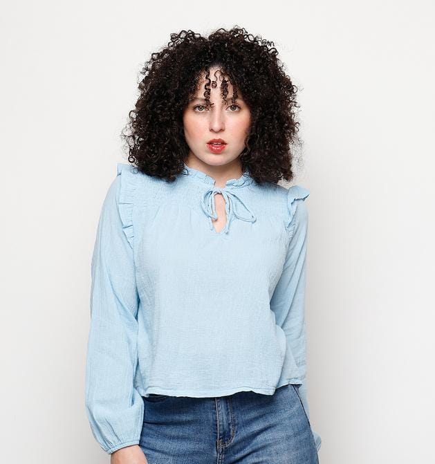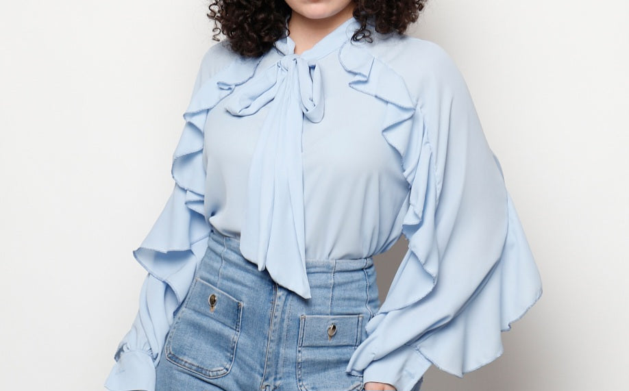 Blusa azul con volantes y lazo en el cuello AGOTADO