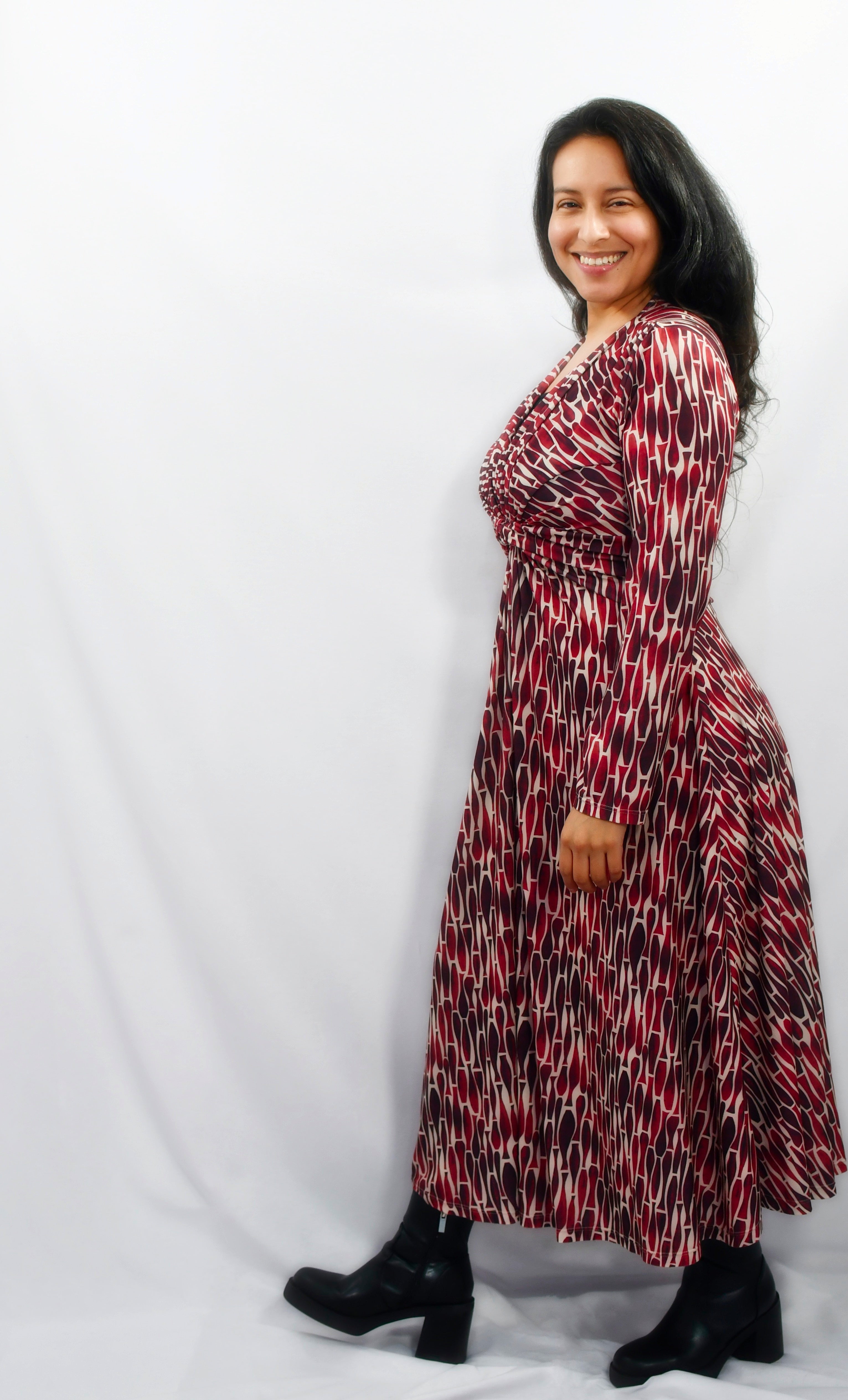 Vestido MIDI nudo estampado abstracto en tonos burdeos